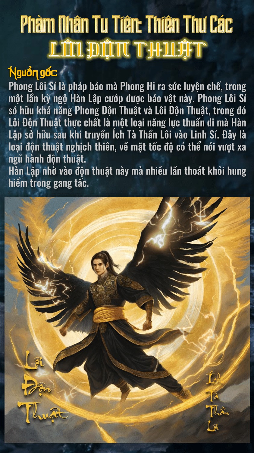 “Lôi Độn Thuật”- Một tuyệt kỹ phải nói là tạo nên thương hiệu của Hàn Lập dù cho ở Nhân giới, Linh giới hay Tiên giới. Độn thuật này xuất phát từ cơ duyên Hàn Lập sở hữu được Phong Lôi Sí. Thực chất là một loại năng lực thuấn di khi ngưòi sở hữu truyền vào Phong Lôi Sí lực lượng lôi điện, cụ thể ở đây là Ích Tà Thần Lôi. Đây là loại độn thuật nghịch thiên, về mặt tốc độ có thể nói còn vượt trên cả Phong Độn Thuật khi xét trên bình diện tu sĩ cùng giai.