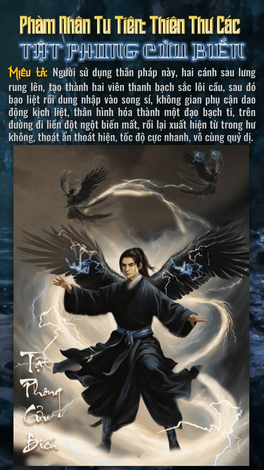 Lại nói rằng Hàn Lập kể từ khi sở hữu được Phong Lôi Sí, thì cứ như rằng ý trời đã định sẵn từ trước công pháp từ quyển sách da thần bí đó phải rơi vào tay Hàn Lập. Có thể “Tật Phong Cửu Biến” chính là công pháp mà gần như cả nhân tộc chỉ duy nhất Hàn Lập mới có thể sử dụng được. Bởi lẽ công pháp này đòi hỏi điều kiện thể chất vô cùng khắc khe, chỉ khi Hàn Lập cơ duyên sở hữu được công pháp luyện thể Minh Vương Quyết từ Phùng gia mật quật và chính thức tu luyện nó đến tầng thứ 3 thì mới có thể miễn cưỡng xem như đạt tiêu chuẩn tu luyện “Tật Phong Cửu Biến” này. Hơn nữa đi khắp nhân tộc cũng khó có một ai sở hữu được hai cánh, cho dù là pháp bảo như Phong Lôi Sí cũng có thể coi gần như là độc nhất vô nhị.